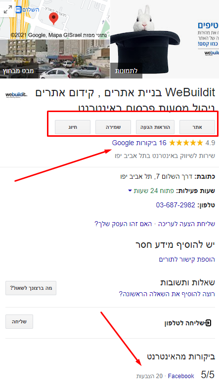 באמצעות השירות הזה תוכלו להפנות את הלקוחות היישר לאתר האינטרנט שלכם, לתקשר איתם במגוון ערוצים, לדעת כמה מהם הגיעו מחיפוש בגוגל ולאפשר להם לדרג אתכם באמצעות ביקורות.